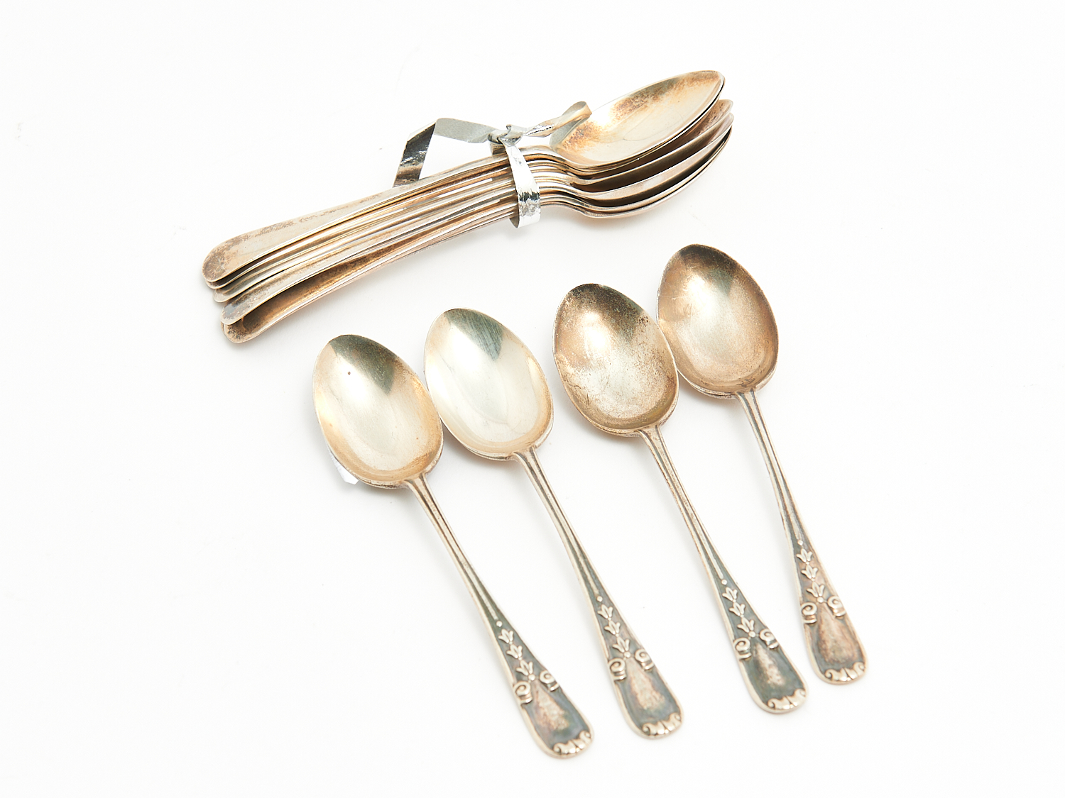 A SET OF SIX STERLING SILVER TEA SPOONS AND ANOTHER SET OF FOUR STERLING SILVER TEA SPOONS L.10.5CM (LONGEST), 112G, LEONARD JOEL LOCAL DELIVERY: SMALL
