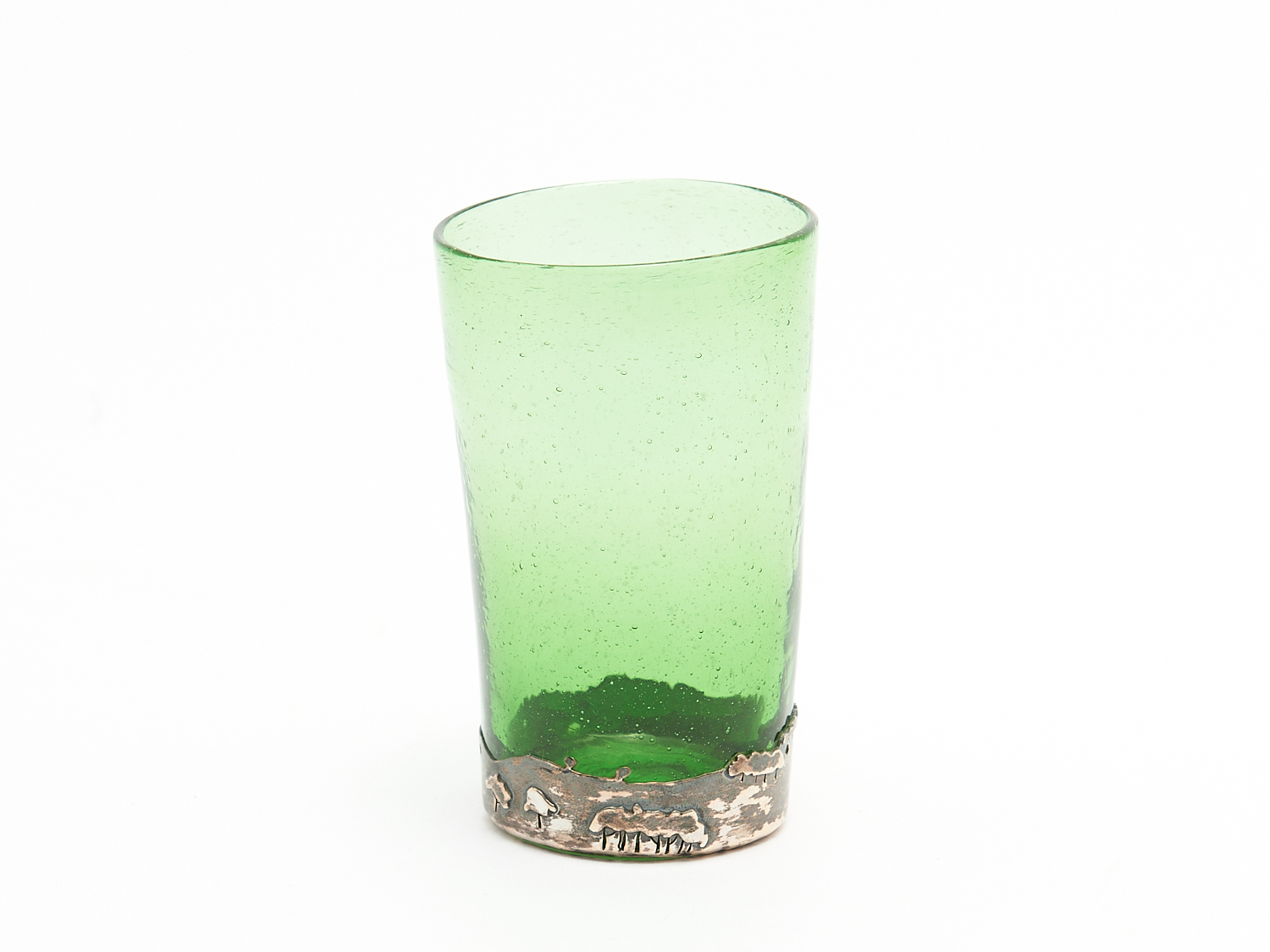 AN ARTS AND CRAFTS HAND BLOWN GREEN GLASS AND STERLING SILVER MOUNTED BEAKER WITH A LANDSCAPE MOTIF H.10CM, LEONARD JOEL LOCAL DELIVERY: SMALL