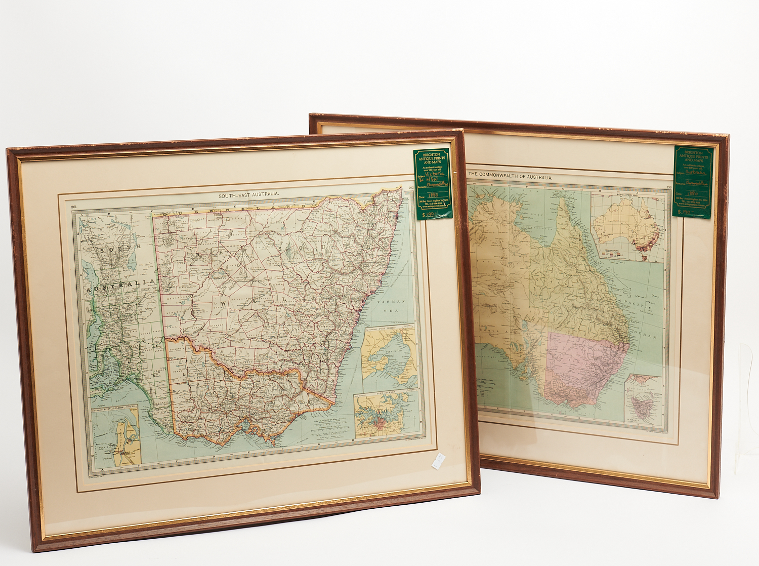 TWO ANTIQUE MAPS, ONE OF AUSTRALIA AND ONE OF SOUTHEAST AUSTRALIA, C.1880, H.53 X W.64CM (EACH), LEONARD JOEL DELIVERY SIZE: MEDIUM