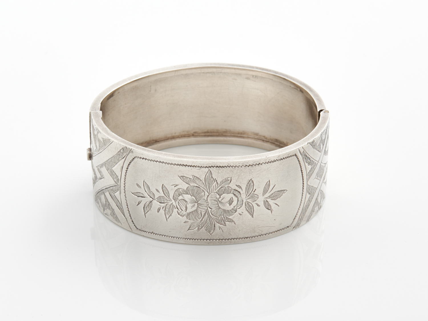 AN ENGRAVED VICTORIAN CUFF IN STERLING SILVER, INNER CIRCUMFERENCE 180MM