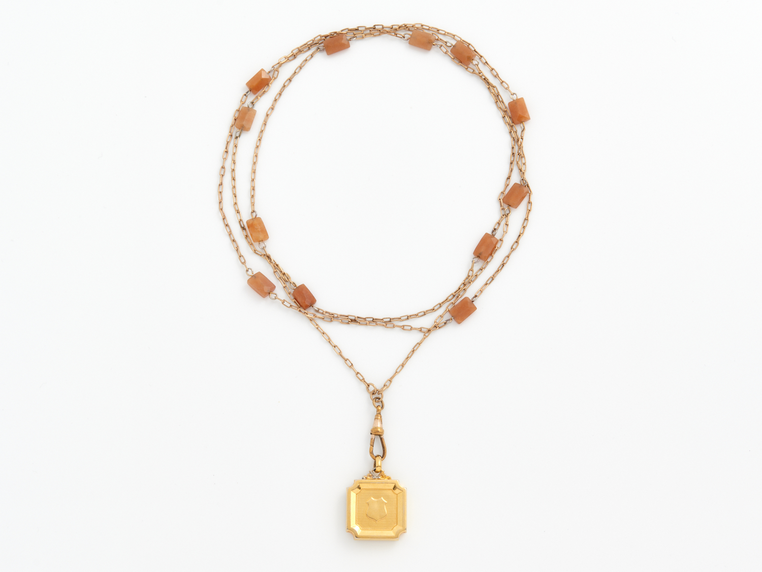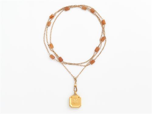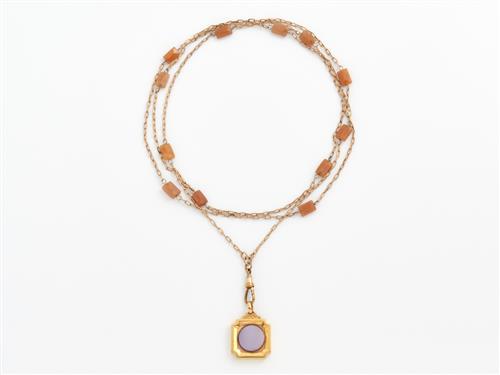 AN ANTIQUE GUARD CHAIN IN SILVER GILT, WITH AGATE BEADS, SUSPENDING AN AGATE SET PENDANT, LENGTH 1240MM