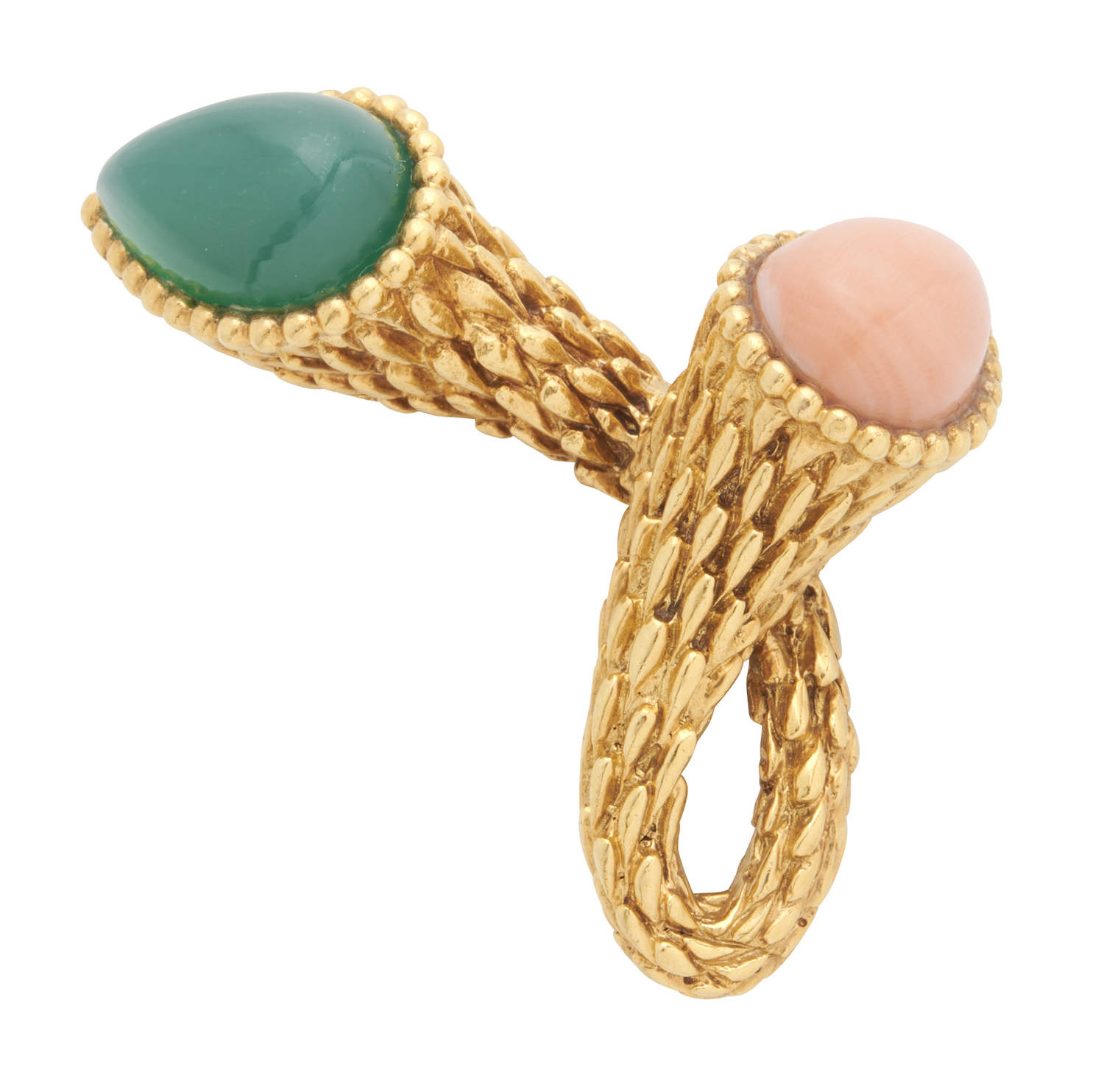 Modelled in textured gold, featuring a pear-shaped cabochon coral weighing approximately 8.00 carats and chalcedony weighing approximately 11.00 carats, signed Boucheron and numbered 19699, measuring approximately 50mm x 30mm, gross weight approximately 29.2 grams.