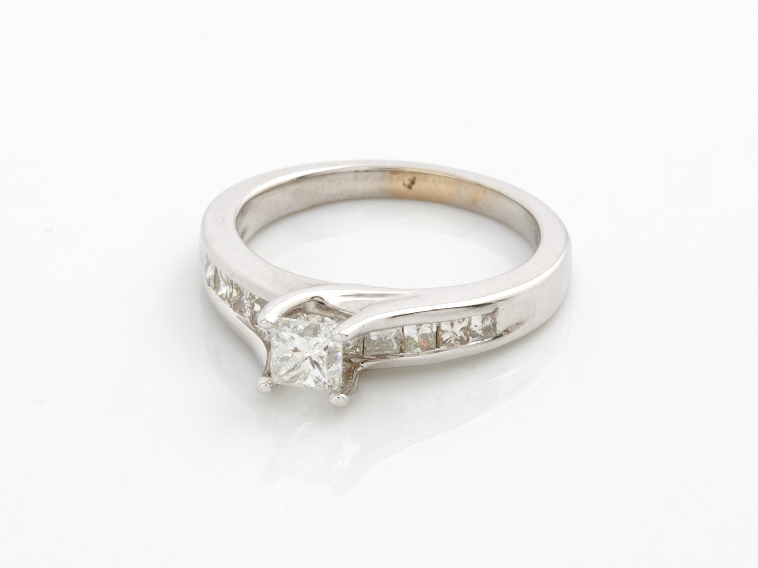 A DIAMOND RING IN 14CT WHITE GOLD, THE DIAMONDS TOTALLING APPROXIMATELY 1.00CTS, SIZE N, 4.1GMS