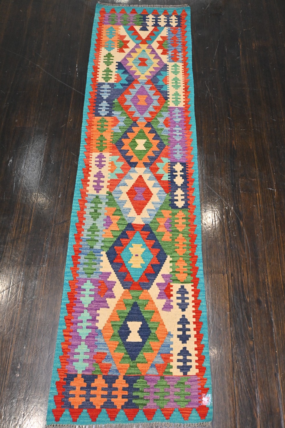 A KAZAH KILIM RUNNER, 100% HAND SPUN WOOL, VEGETABLE DYES, REVERSIBLE, ALL HAND WOVEN IN AFGHANISTAN. (288 X 75 CM) (LEONARD JOEL DELIVERY SIZE: LARGE)