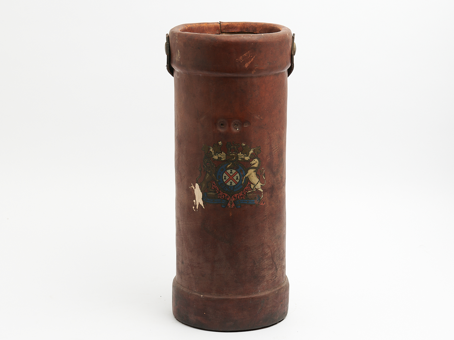 AN ANTIQUE LEATHER CORDITE BUCKET WITH ENGLISH COAT OF ARMS (A/F) H.51CM, LEONARD JOEL LOCAL DELIVERY: MEDIUM