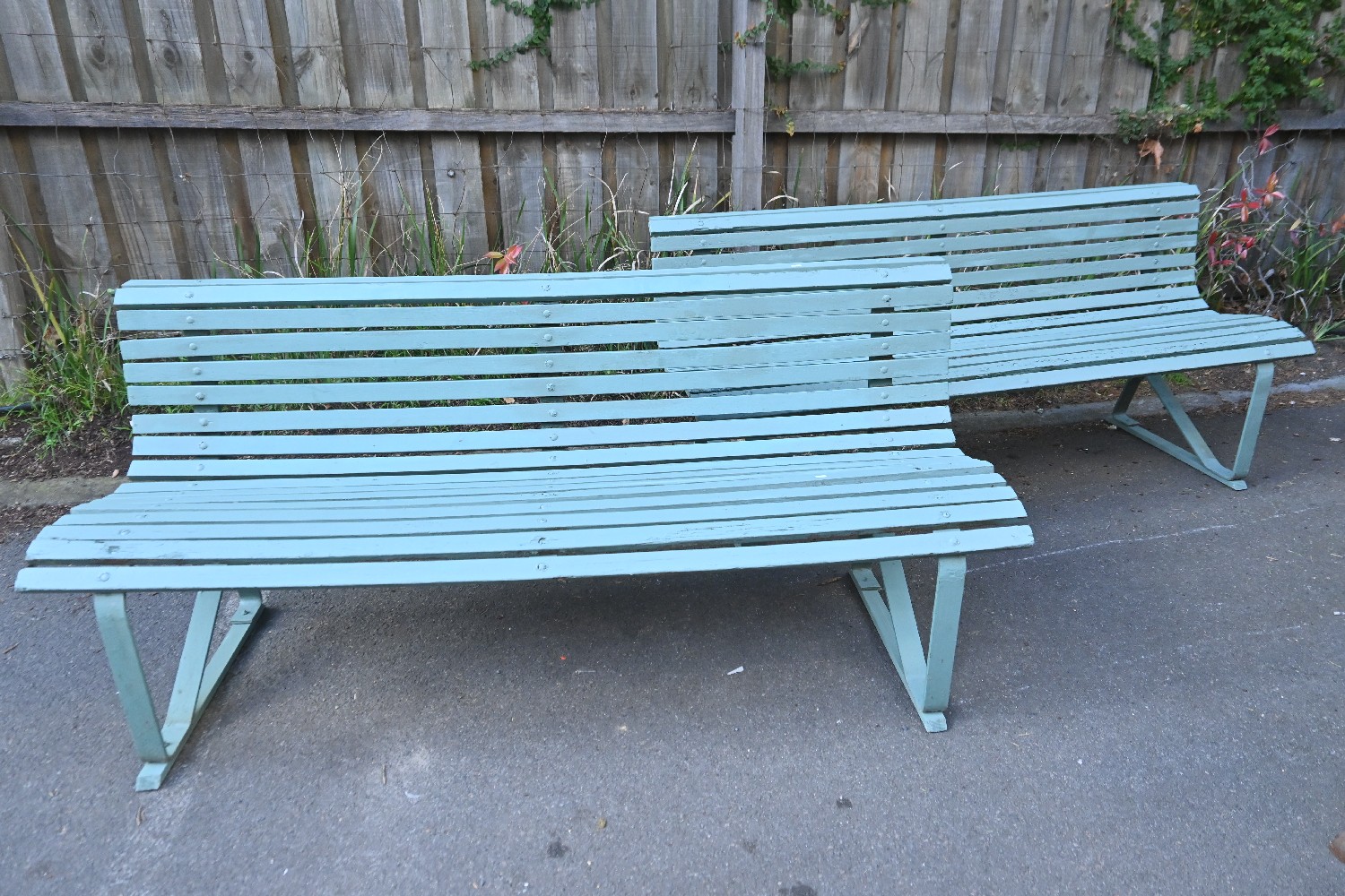 A MATHCING PAIR OF 1950'S/60'S SLAT OUTDOOR BENCHES (81CM H X 181CM W X 64CM D) (PLEASE NOTE THIS HEAVY ITEM MUST BE REMOVED BY CARRIERS AT THE CUSTOMER'S EXPENSE. LEONARD JOEL STAFF CANNOT ASSIST CARRYING THIS ITEM) (X-LARGE ITEM)