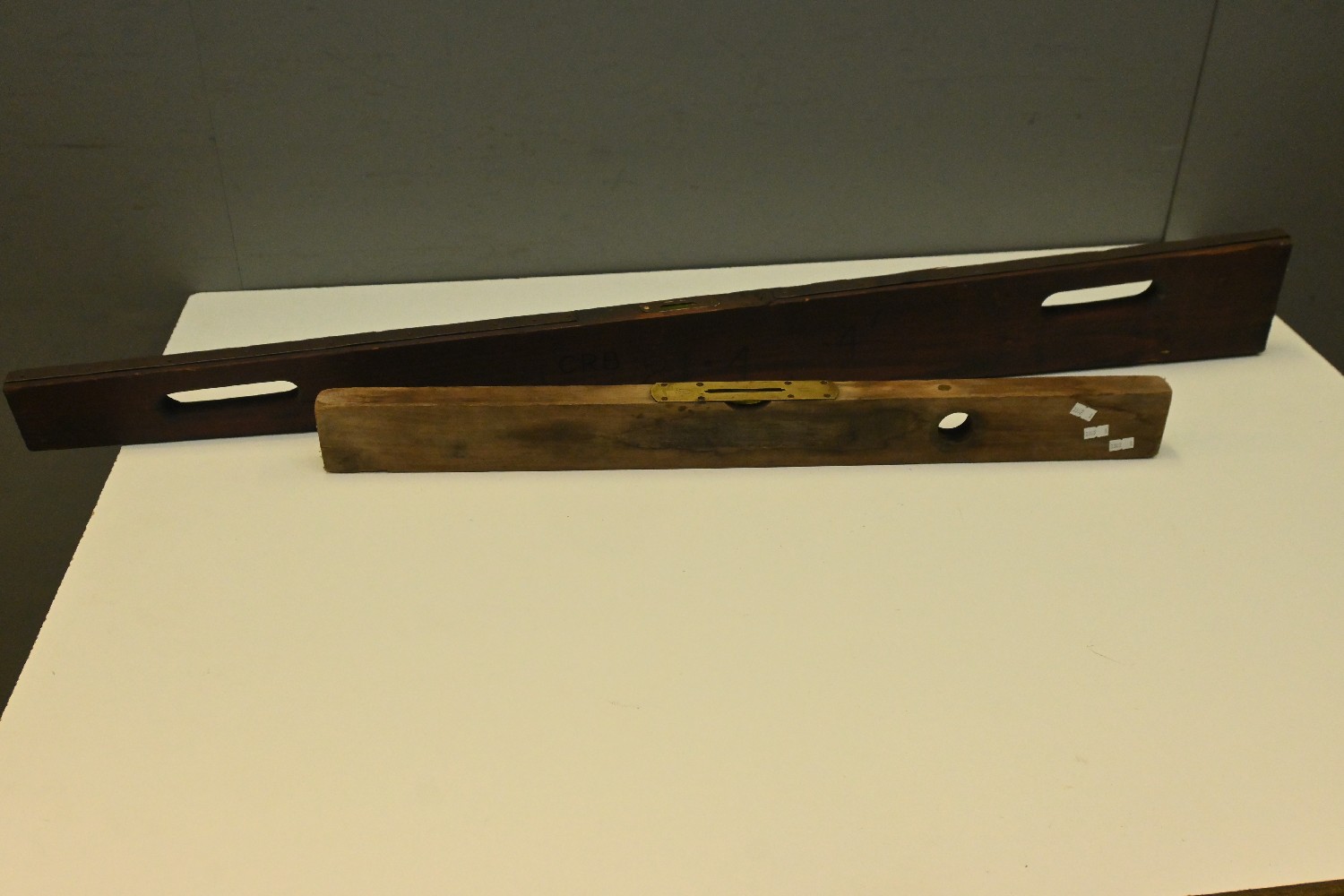TWO ANTIQUE WOOD-CASE SPIRIT LEVELS (A/F) (THE LARGEST 122 CM LONG) (LEONARD JOEL DELIVERY SIZE: LARGE)