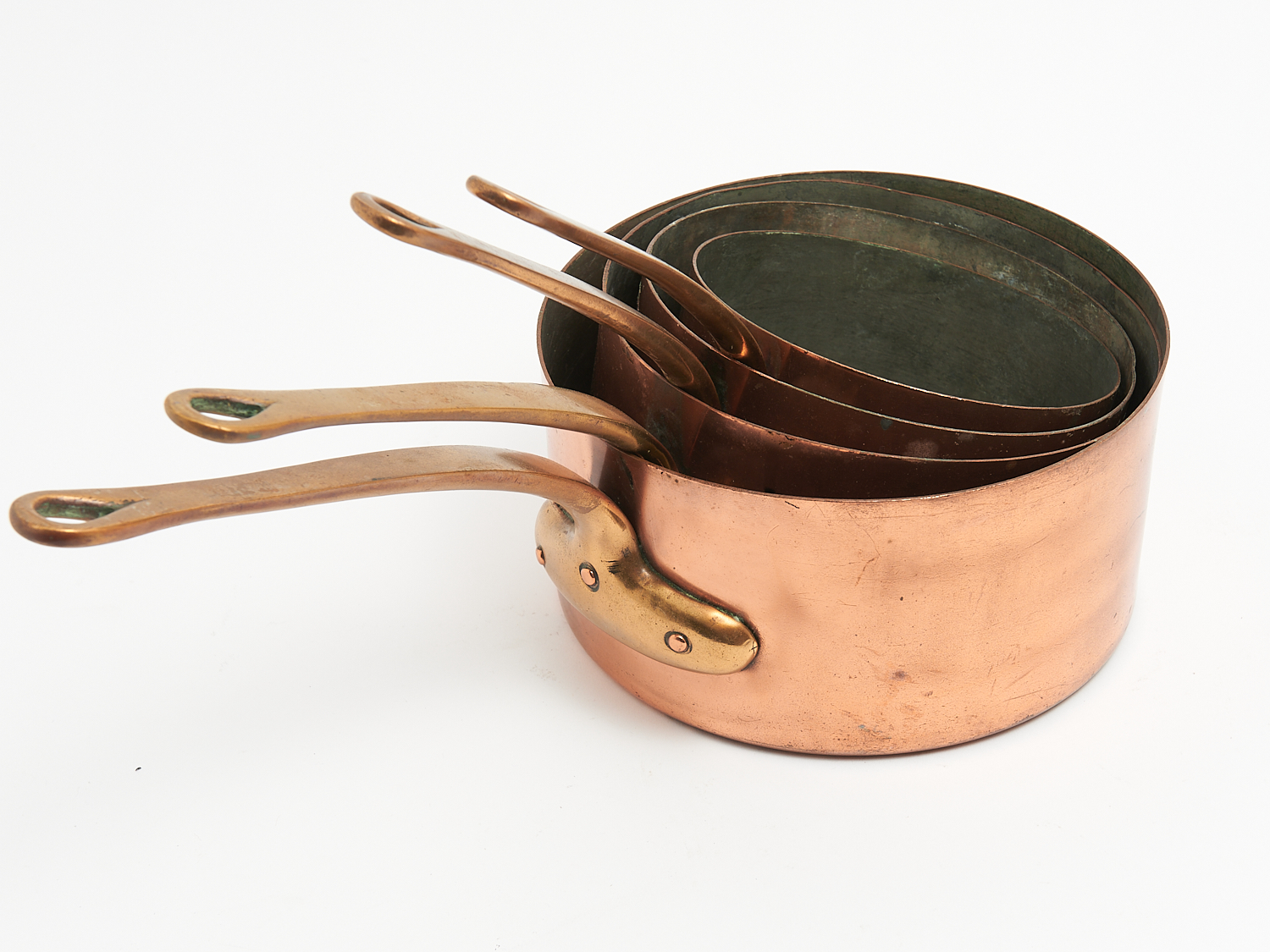 A SET OF FOUR GRADUATED COPPER SAUCEPANS DIA.22CM, LEONARD JOEL LOCAL DELIVERY: MEDIUM