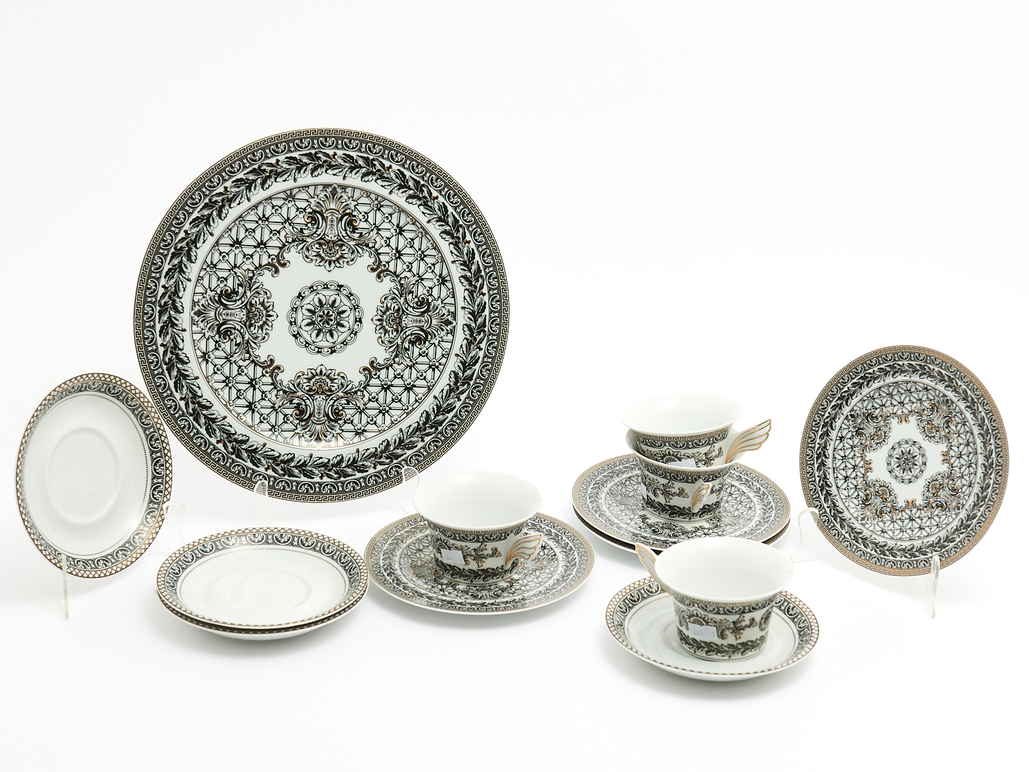 A VERSACE FOR ROSENTHAL PORCELAIN TEA SERVICE COMPRISING FOUR TEACUPS AND SAUCERS, FOUR SIDE PLATES AND A CAKE PLATE DIA.31CM (CAKE PLATE), LEONARD JOEL LOCAL DELIVERY: MEDIUM