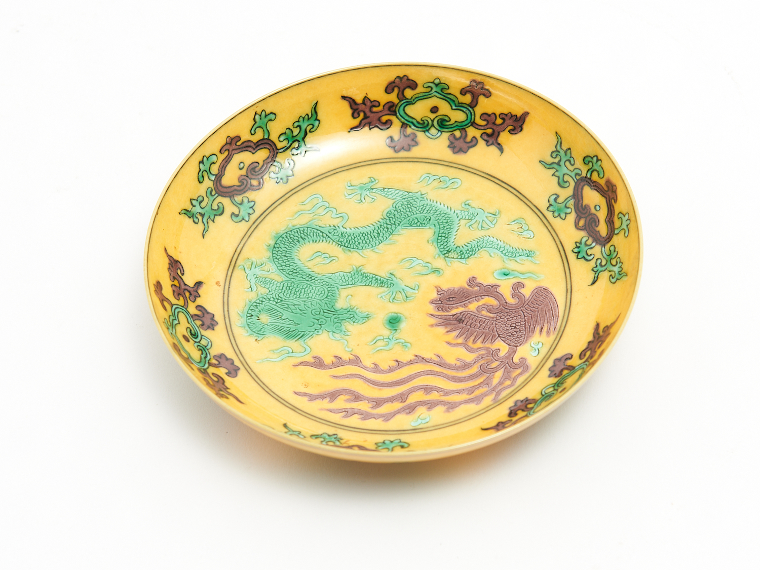 A DRAGON DISH ON A YELLOW GROUND DIA.13CM, LEONARD JOEL LOCAL DELIVERY: SMALL