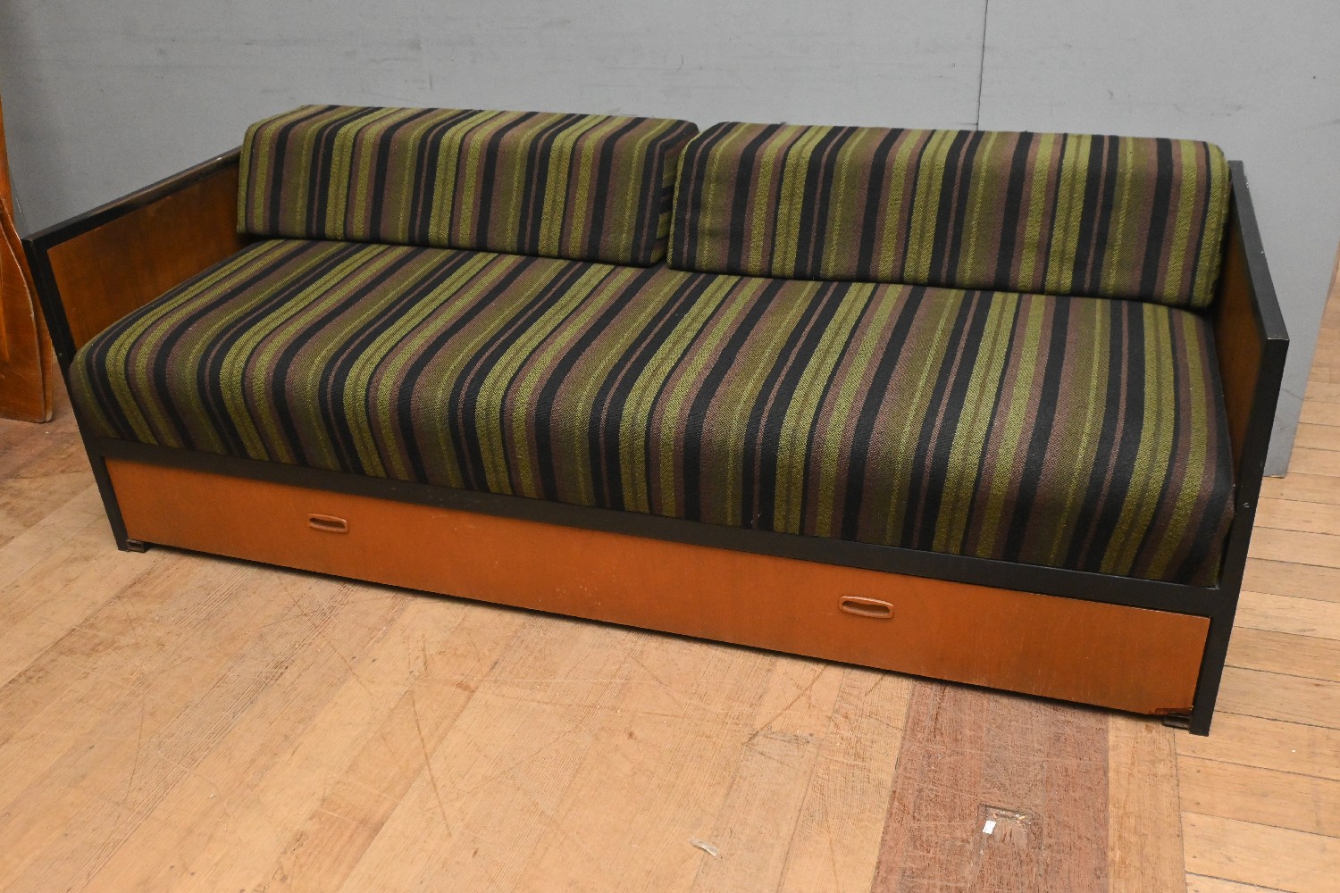 A 1970s DAYBED WITH STORAGE DRAWER (86H X 189W X 76D CM) (PLEASE NOTE THIS HEAVY ITEM MUST BE REMOVED BY CARRIERS AT THE CUSTOMER'S EXPENSE. LEONARD JOEL STAFF CANNOT ASSIST CARRYING THIS ITEM) (X-LARGE ITEM)