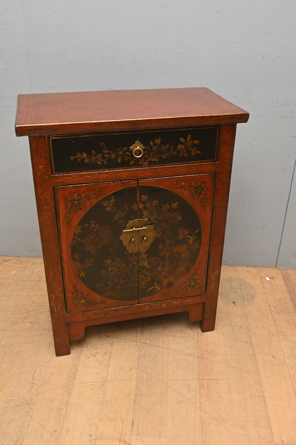 A SMALL CHINESE RED-LACQUERED TWO DOOR AND SINGLE DRAWER SIDE CABINET (87H X 68W X 38D CM) (LEONARD JOEL DELIVERY SIZE: LARGE)