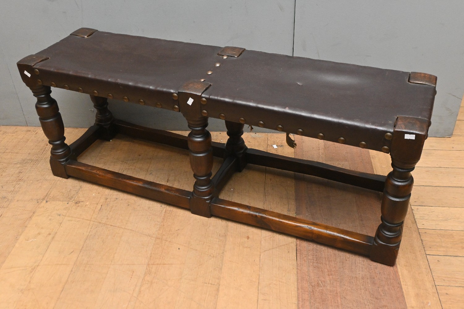 A 17TH CENTURY STYLE LEATHER UPHOLSTERED BENCH SEAT (A/F) (45CM H X 121CM W X 32CM D) (LEONARD JOEL DELIVERY SIZE: LARGE)