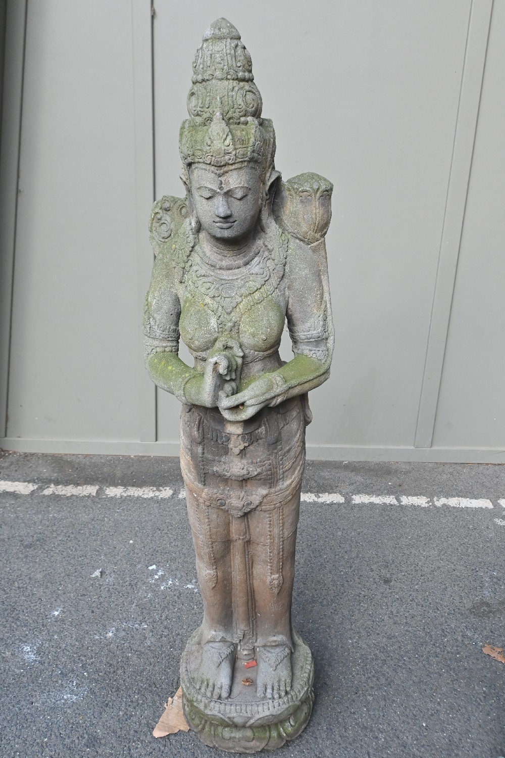 A LARGE RECONSTITUTED STONE STANDING FIGURE OF A DIETY (152H X 36W X 28D CM) (PLEASE NOTE THIS HEAVY ITEM MUST BE REMOVED BY CARRIERS AT THE CUSTOMER'S EXPENSE. LEONARD JOEL STAFF CANNOT ASSIST CARRYING THIS ITEM) (X-LARGE ITEM)