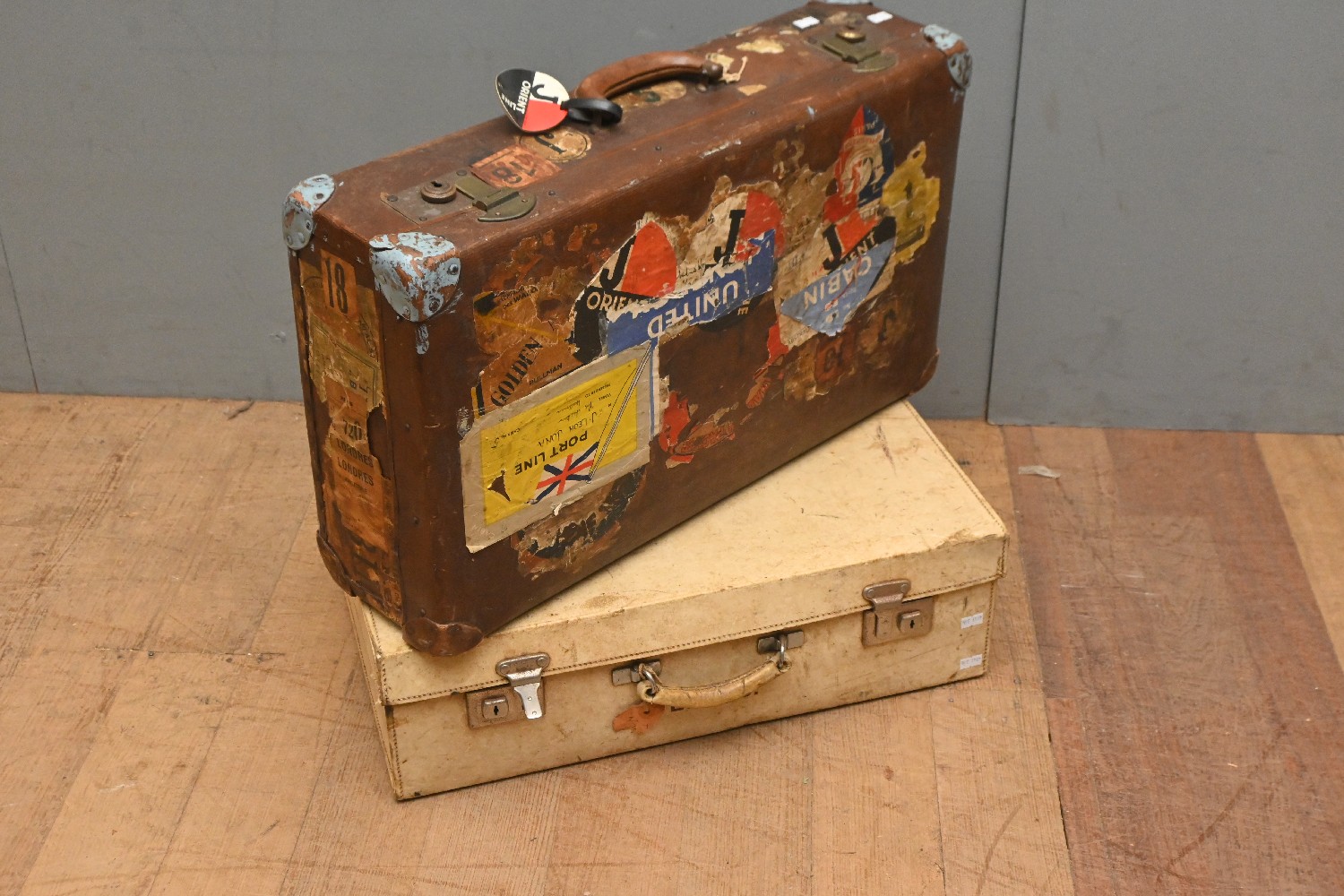 TWO VINTAGE SUITCASES INCLUDING ONE WITH SHIPPING LINE STICKERS AND THE OTHER WITH VELLUM COVERING (17CM H X 61CM W X 35CM D) (LEONARD JOEL DELIVERY SIZE: LARGE)
