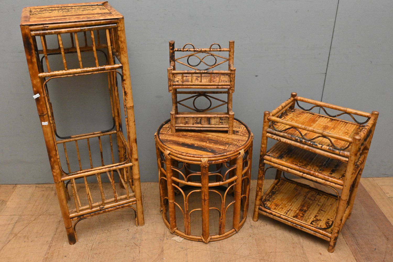 A COLLECTION OF FOUR EARLY 20TH CENTURY TORTOISESHELL EFFECT BAMBOO ITEMS INCL. JARDINIERE PLANT STAND, CIRCULAR TABLE, WALL RACK AND RECTANGULAR THREE TIER TABLE (THE LARGEST 100CM H X 36CM W X 36CM D) (LEONARD JOEL DELIVERY SIZE: X- LARGE)