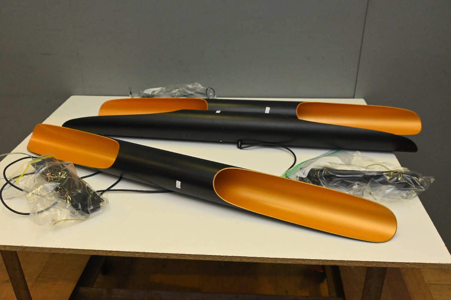 A SET OF THREE CYLINDER FORM GOLD AND BLACK HANGING CEILING LIGHT SHADES (UNTESTED) (A/F) (113 LONG CM) (LEONARD JOEL DELIVERY SIZE: LARGE)