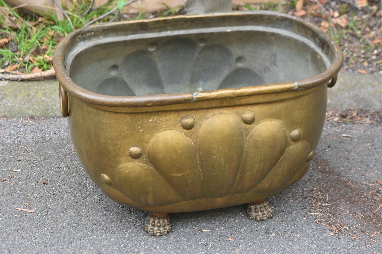 A FRENCH SOLID BRASS OVAL JARDINIERE POT ON LION PAW FEET (32CM H X 55CM W X 38CM D) (LEONARD JOEL DELIVERY SIZE: X- LARGE)