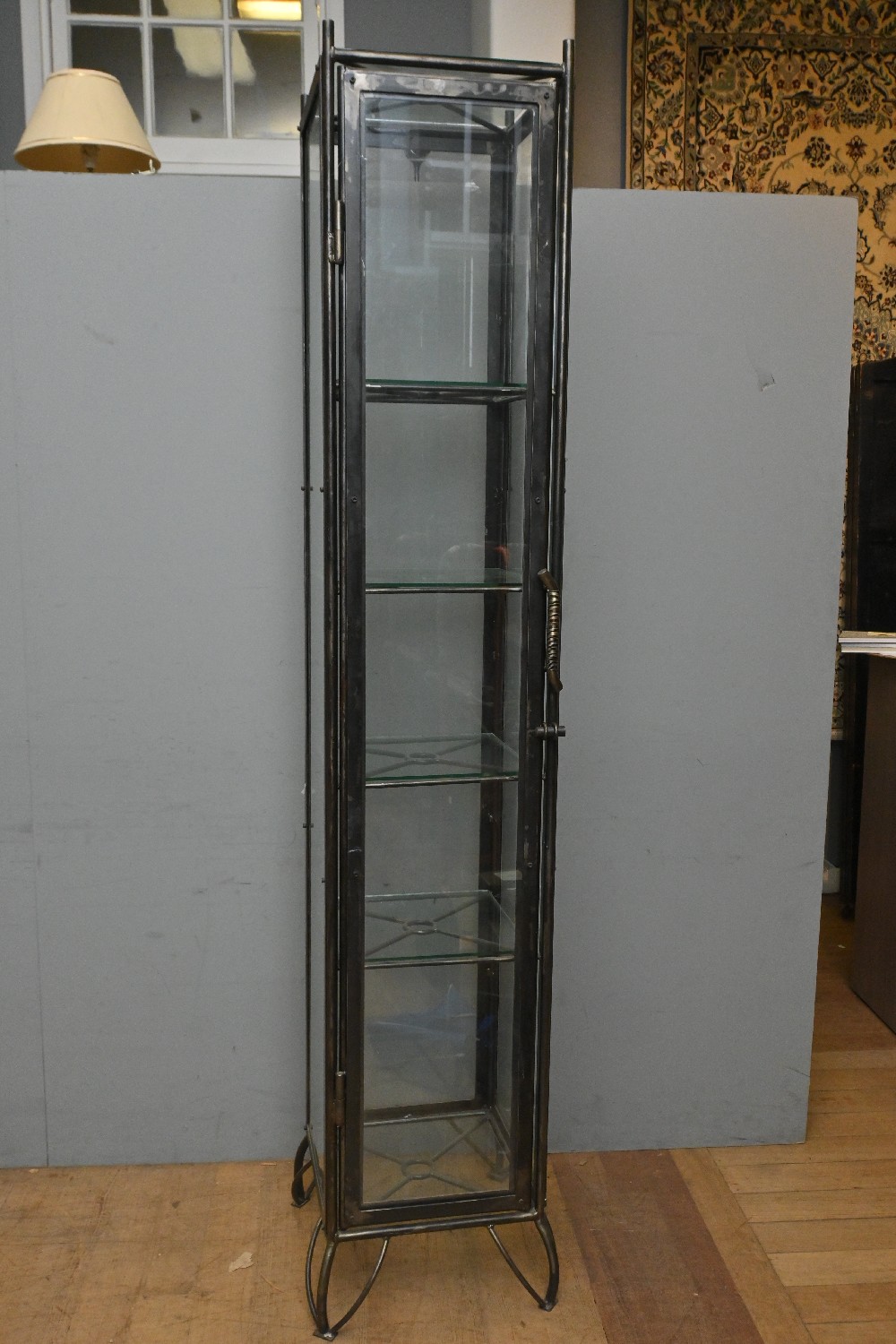 A COMBO DESIGN BRUSHED BLACK METAL AND GLASS DISPLAY CABINET, MANUFACTURED BY EVAN JOHN PHILIP PTY LTD, QUEENSLAND. (A/F) (221H X 46W X 46D CM) (PLEASE NOTE THIS HEAVY ITEM MUST BE REMOVED BY CARRIERS AT THE CUSTOMER'S EXPENSE. LEONARD JOEL STAFF CANNOT ASSIST CARRYING THIS ITEM) (X-LARGE ITEM)
