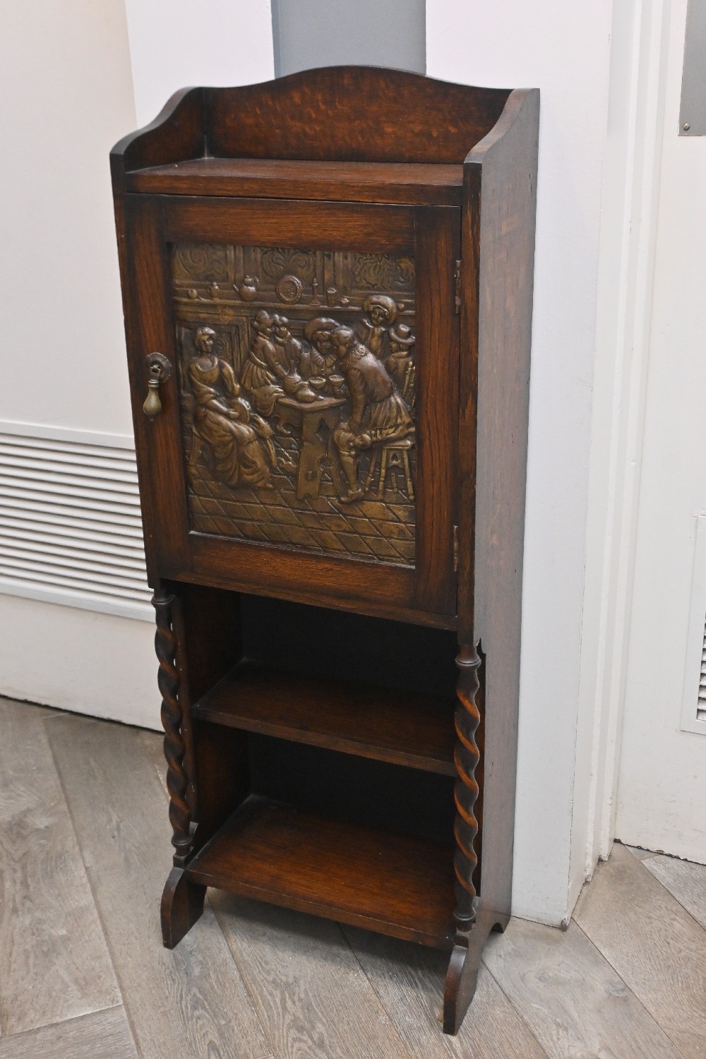 AN EARLY 20TH CENTURY STAINED OAK SINGLE DOOR BOOKCASE/SIDE CABINET WITH REPOUSSE BRASS PICTORAL PANEL, (A/F) (110CM H X 42W X 20D CM) (LEONARD JOEL DELIVERY SIZE: LARGE)