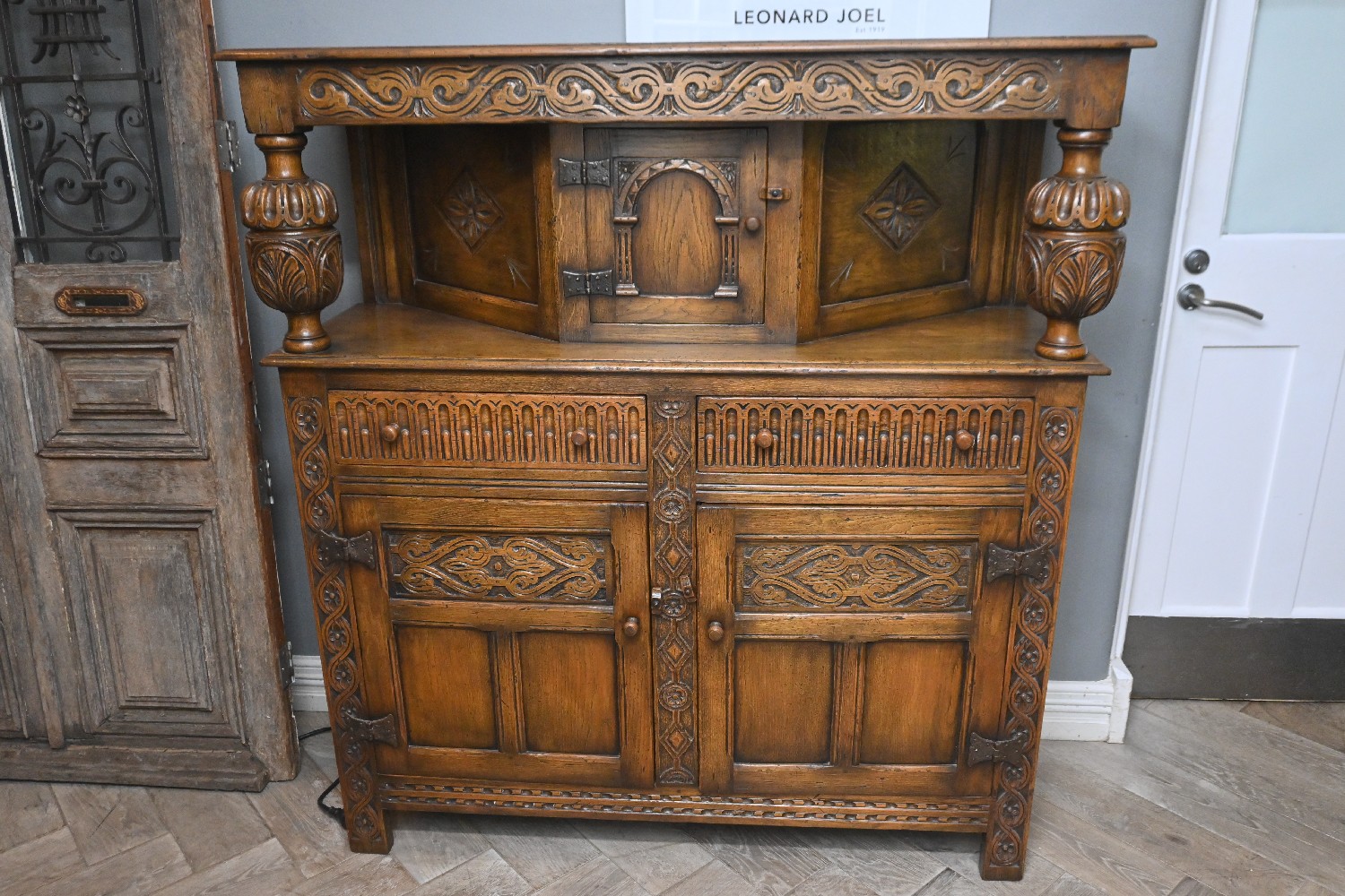 AN EARLY 20th CHARLES II-STYLE OAK COURT CUPBOARD (142H X 130W X 44D CM) (PLEASE NOTE THIS HEAVY ITEM MUST BE REMOVED BY CARRIERS AT THE CUSTOMER'S EXPENSE. LEONARD JOEL STAFF CANNOT ASSIST CARRYING THIS ITEM) (X-LARGE ITEM)