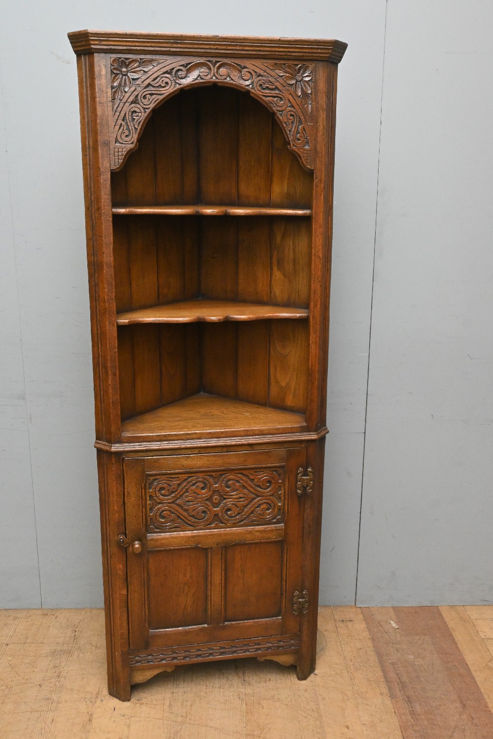 A CARVED OAK CORNER CABINET (178CM H X 65CM W X 40CM) (LEONARD JOEL DELIVERY SIZE: X- LARGE)