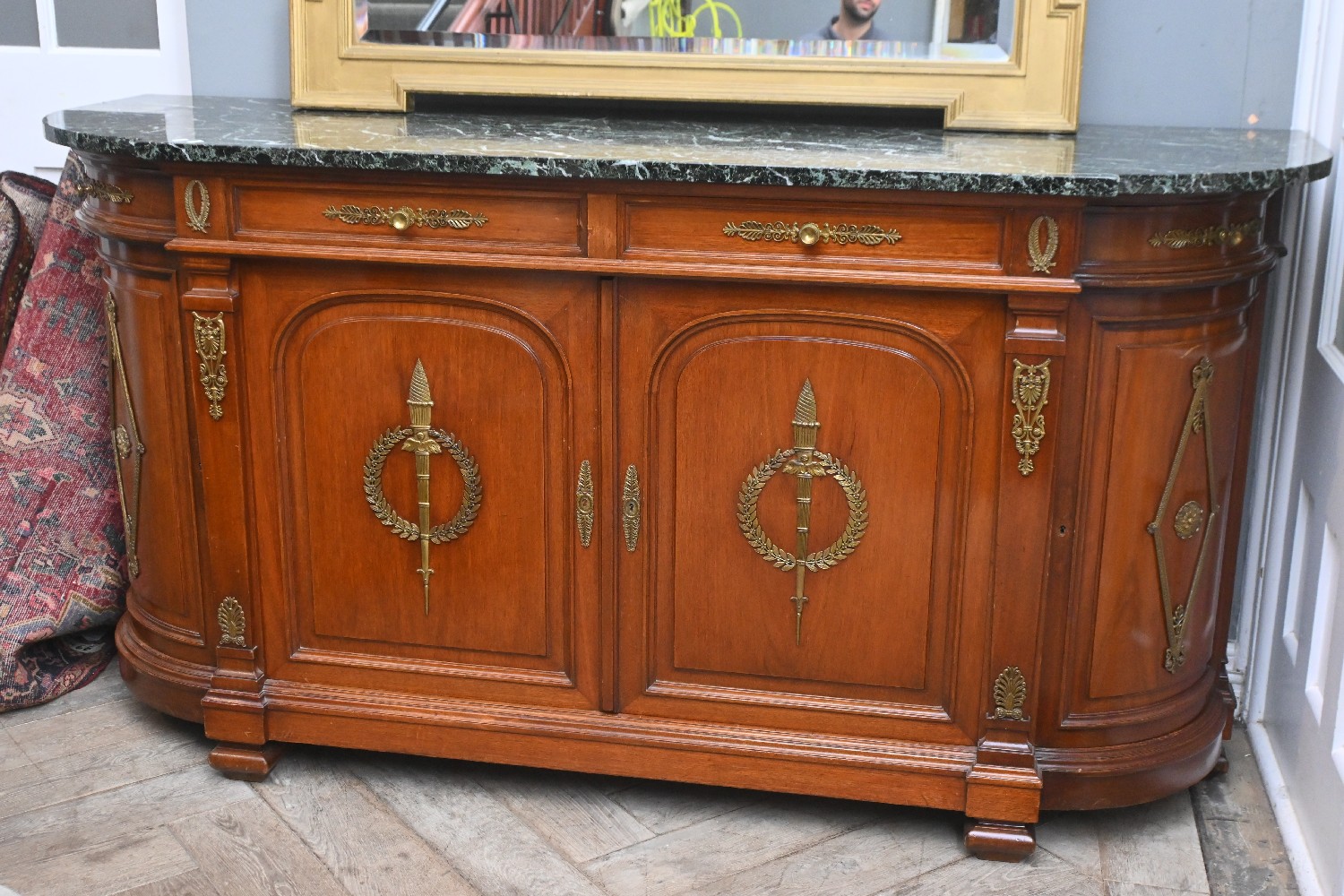 A FRENCH EMPIRE STYLE MARBLE TOP SIDEBOARD (101CM H X 196CM W X 63CM D) (PLEASE NOTE THIS HEAVY ITEM MUST BE REMOVED BY CARRIERS AT THE CUSTOMER'S EXPENSE. LEONARD JOEL STAFF CANNOT ASSIST CARRYING THIS ITEM) (X-LARGE ITEM)