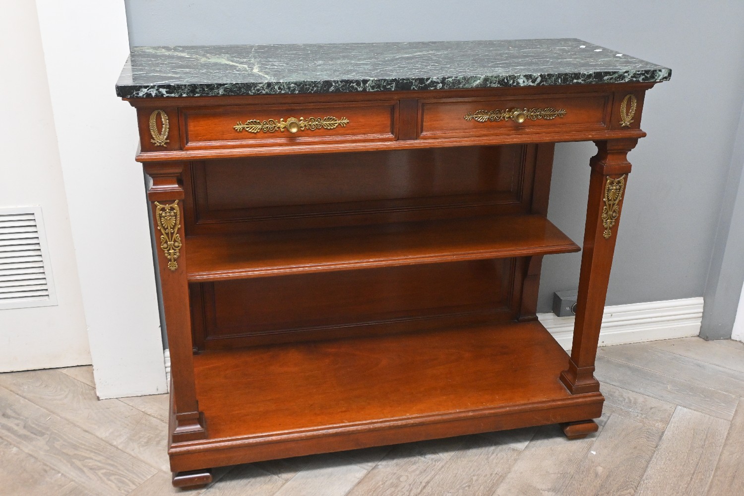 A FRENCH EMPIRE STYLE MARBLE TOP SERVING TABLE/CONSOLE (A/F) (102CM H X 118W X 50D CM) (LEONARD JOEL DELIVERY SIZE: X-LARGE)