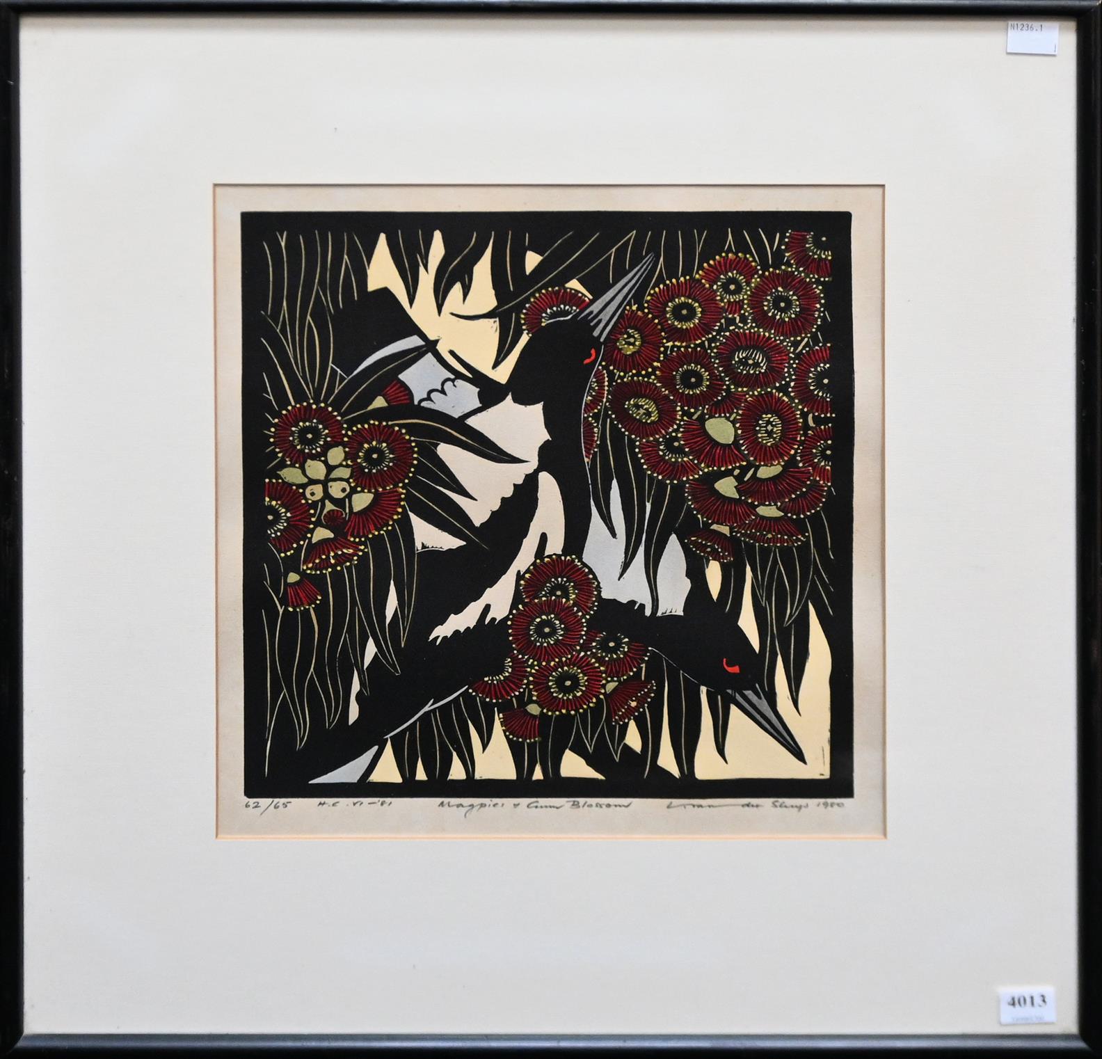 LESLIE VAN DER SLUYS, MAGPIES + GUM BLOSSOM 1980, LINOCUT ED. 62/65, SIGNED, DATED, TITLED AND EDITIONED BELOW IMAGE, 30 X 27.5CM, FRAME SIZE: 54.5 X 49.5CM