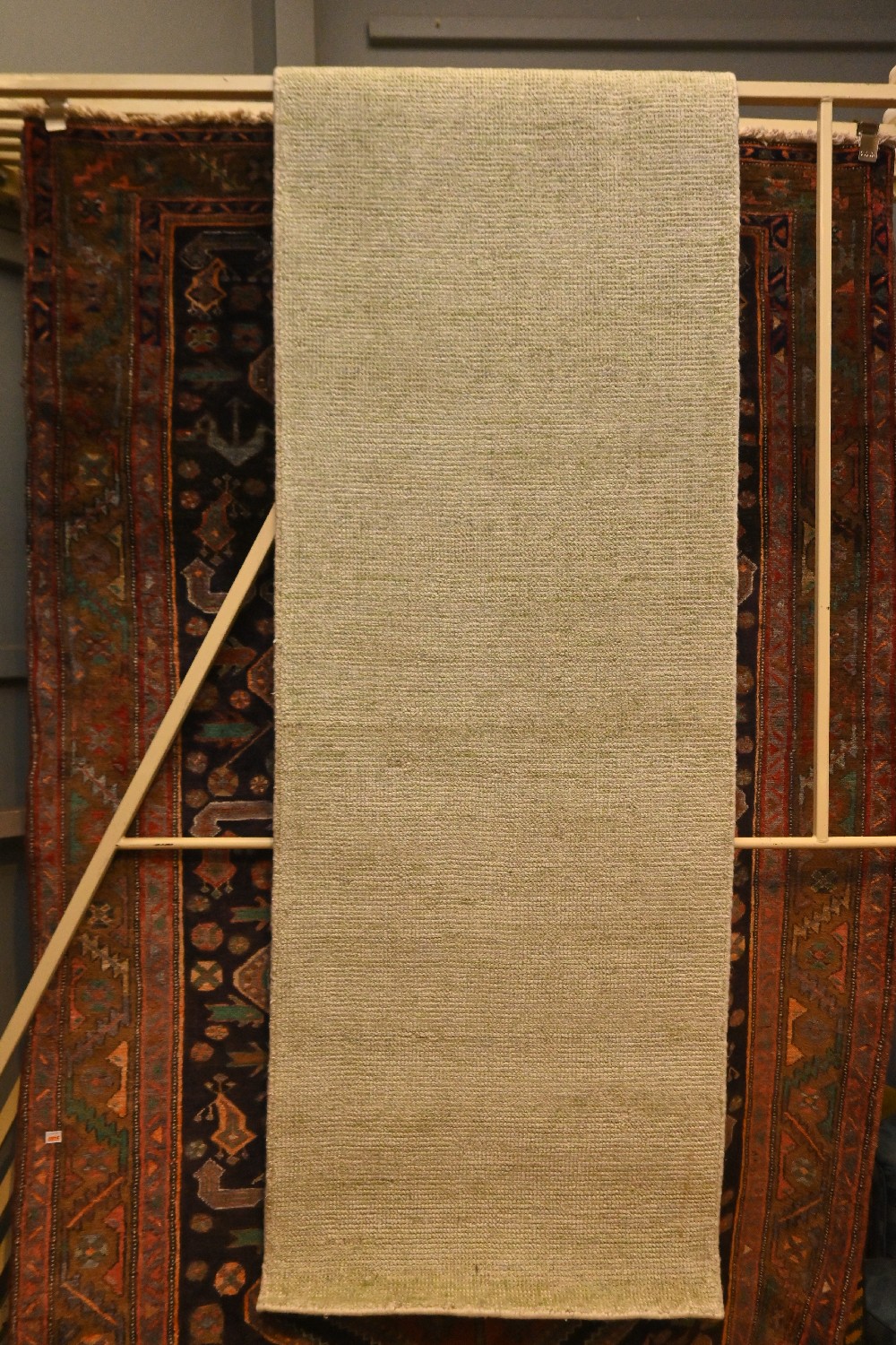 A BRAND-NEW HAND MADE MODERN RUNNER. WOOL AND SILKY TEXTURE. IN TONES OF IVORY AND GREEN. SIZE: 390 X 72 CM ORIGIN: INDIA
