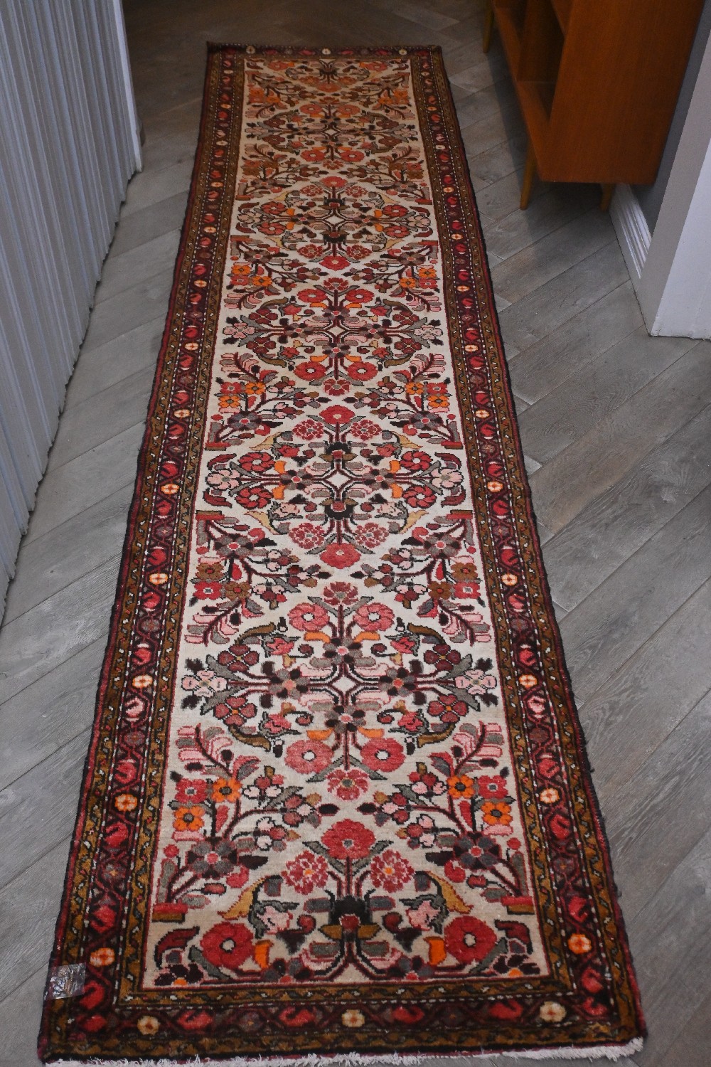 A PERSIAN BORCHALU RUNNER 100% PLUSH WOOL. HAND-KNOTTED WITH BEAUTIFUL CONTINUING DIAMOND FLORAL MEDALLIONS ON AN IVORY FIELD. ALL OVER SOFT TONES OF ROSE, SOFT PINK, BURGUNDY, AND A HINT OF GREY. BORDER OF FLORAL MOTIFS. SIZE: 360 X 85 CM ORIGIN: IRAN – RRP: $2,200 DOCUMENTATION OF AUTHENTICITY INCLUDED.