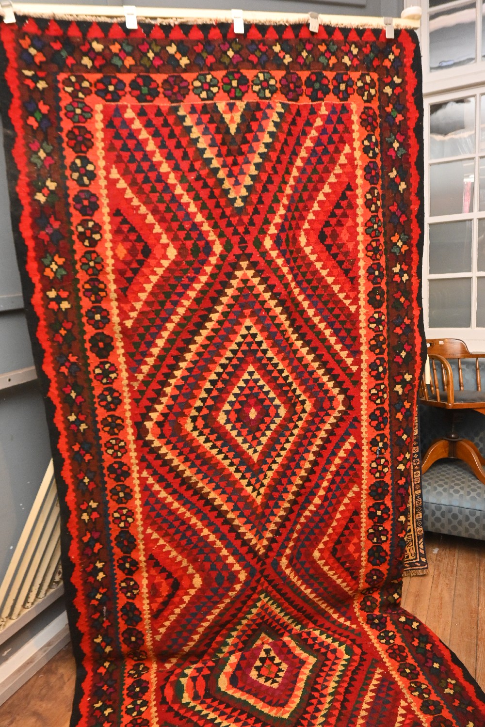 PERSIAN KURDISH KILIM, COLOURFUL GEOMETRIC DESIGN. 100% HAND KNOTTED WOOL AND WEAVE AND VEGETABLE DYES. (A/F) SIZE: 345 X 154 CM - RRP: $950 ORIGIN: IRAN