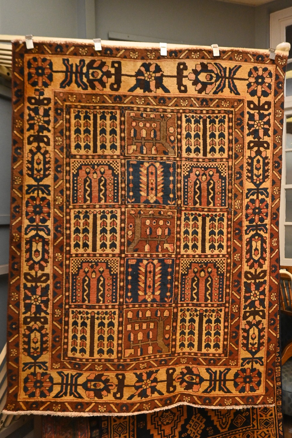 A 1970'S TRIBAL PERSIAN BAKHTIAR RUG. 100% WOOL, NATURAL DYES. HAND-KNOTTED TRIBAL BAKHTIARI WEAVE WITH TRADITIONAL "GARDEN" DESIGN WITH PANELS CONTAINING GARDEN THEMES OF TRIBAL TREE AND FLOWERS, PRAYER NICHE AND GEOMETRIC MOTIFS. BORDER OF LARGE TRIBAL MOTIFS, PALMETTES & ROSETTES. SIZE: 194 X 146 CM ORIGIN: PERSIA – RRP: $1,200 DOCUMENTATION OF AUTHENTICITY INCLUDED.