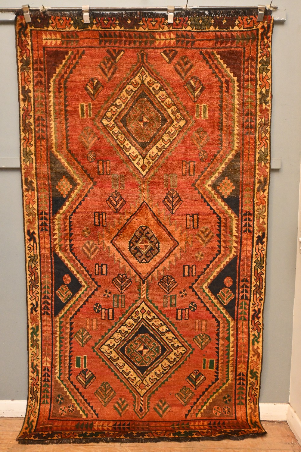 A 1970'S PERSIAN NOMADIC SHAHSAVAN RUG. 100% WOOL. NATURAL DYES. DESIGN OF TRIPLE CONTINUING DIAMOND CENTRAL MEDALLIONS CONTAINING AMULETS ON A SOFT RED FIELD OF MINIATURE TRIBAL ROSETTES AND WILLOW TREES. BORDER OF TRIBAL GEOMETRIC MOTIFS. SIZE: 249 X 141 CM ORIGIN: PERSIA - RRP: $1,300 DOCUMENTATION OF AUTHENTICITY INCLUDED