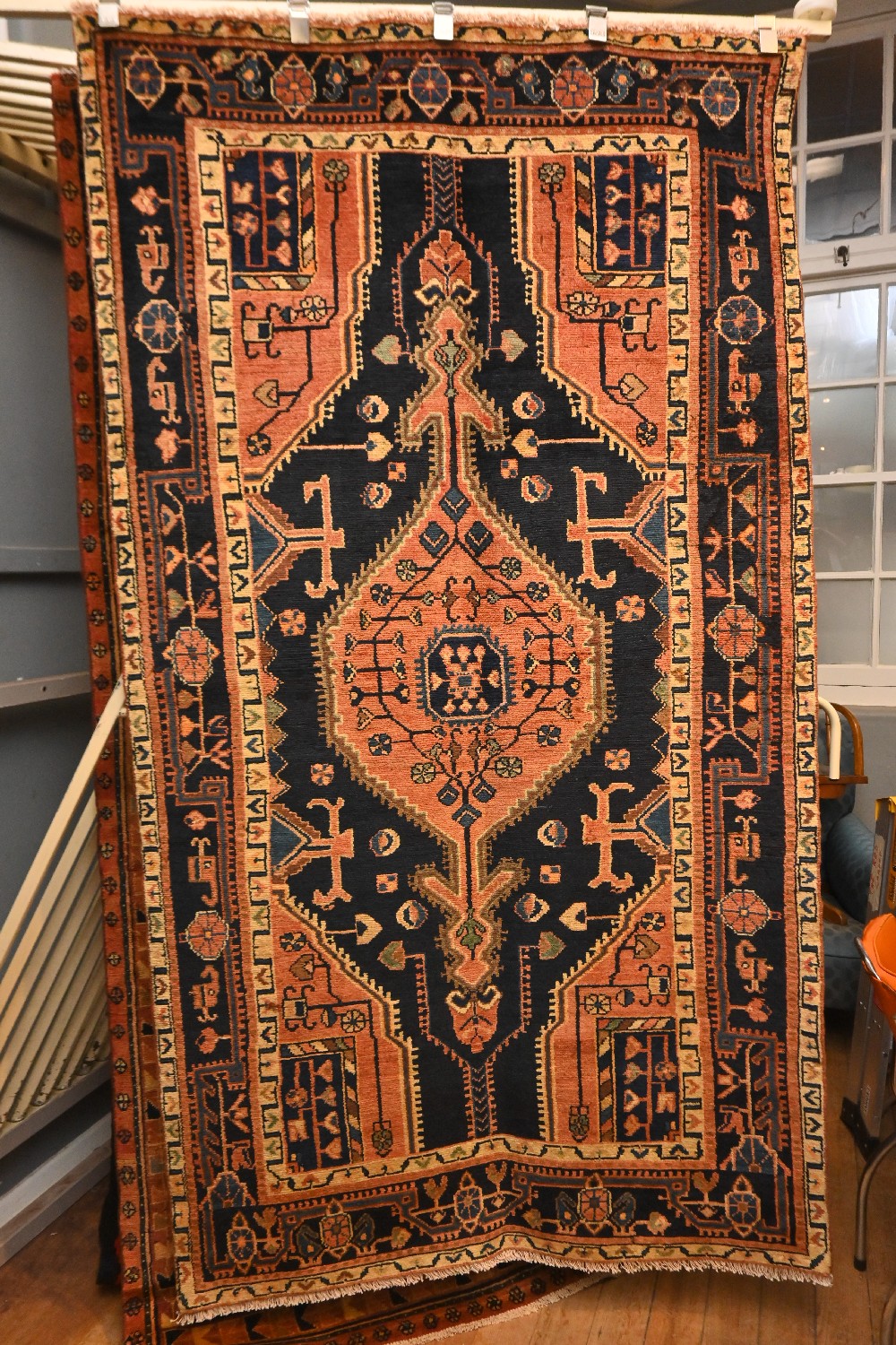 A TRIBAL PERSIAN TOYSERKAN RUG. 100% HAND SPUN WOOL, NATURAL DYES. HAND-KNOTTED VILLAGE WEAVE WITH TRIBAL DESIGN OF A CENTRAL HEXAGONAL ANCHORED MEDALLION IN RED TONES ON A DEEP NAVY FIELD OF TRIBAL MOTIFS & CORNER MEDALLIONS IN A RED-TONED FIELD OF TREE OF LIFE AND GEOMETRIC PATTERNS. BORDER OF TRIBAL ROSETTES & GEOMETRIC MOTIFS AND PAISLEY SIZE: 239 X 130 CM- RRP $1,500 ORIGIN: PERSIA DOCUMENTATION OF AUTHENTICITY INCLUDED