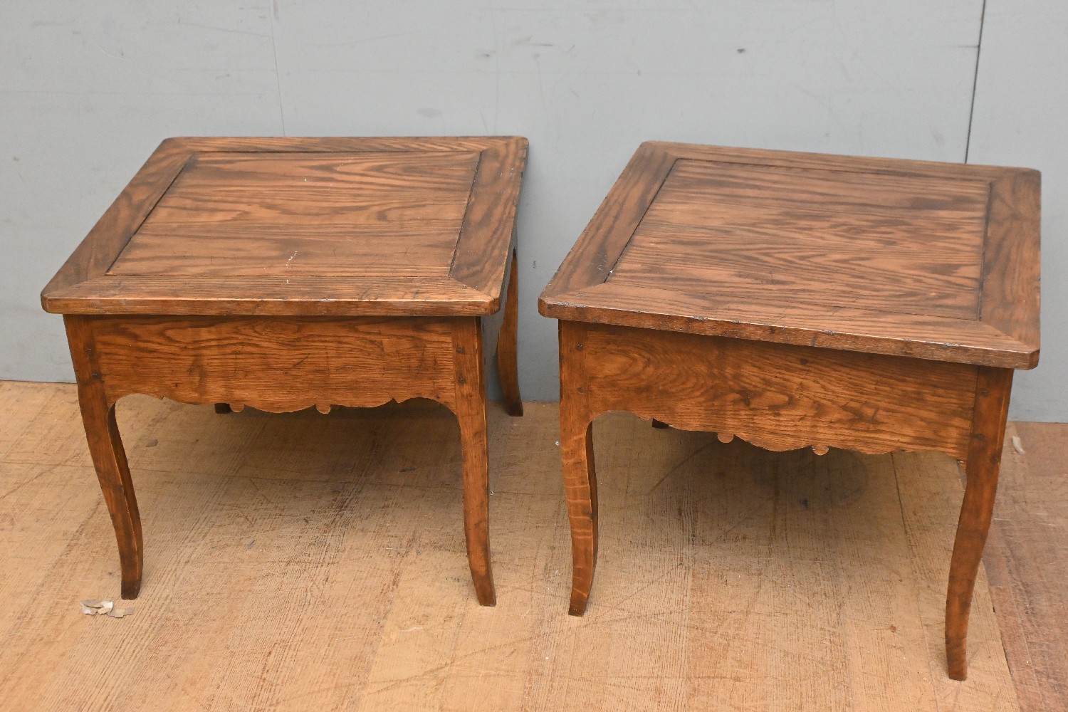 A PAIR OF OAK FRENCH STYLE SABRE LEG SIDE TABLES (52CM H X 60CM W X 60CM D) (LEONARD JOEL DELIVERY SIZE: LARGE)