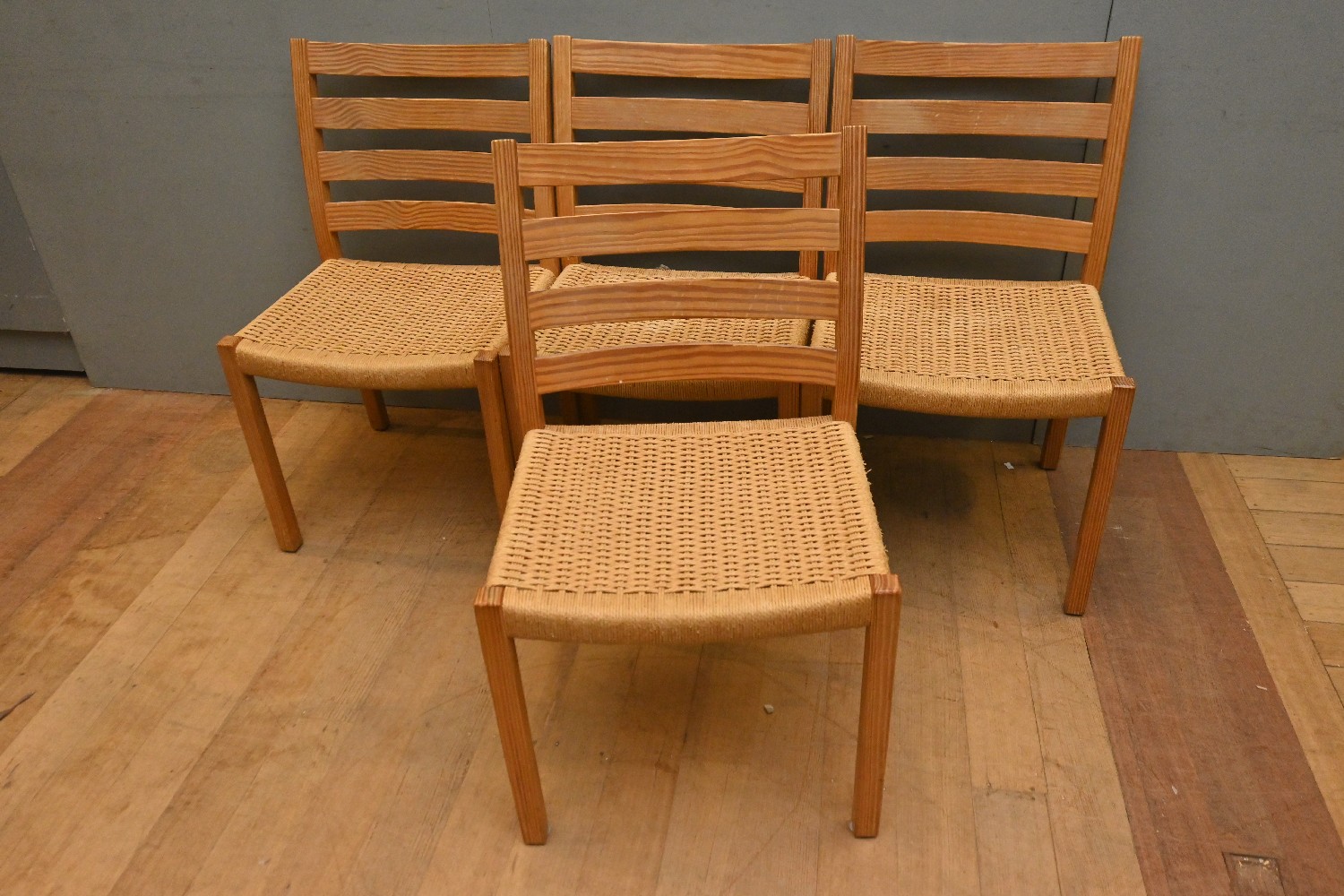 A SET OF FOUR OREGON PINE DANISH CHAIRS, (A/F) (86HCM X 50CM W X 54CM D) (LEONARD JOEL DELIVERY: LARGE ITEM)