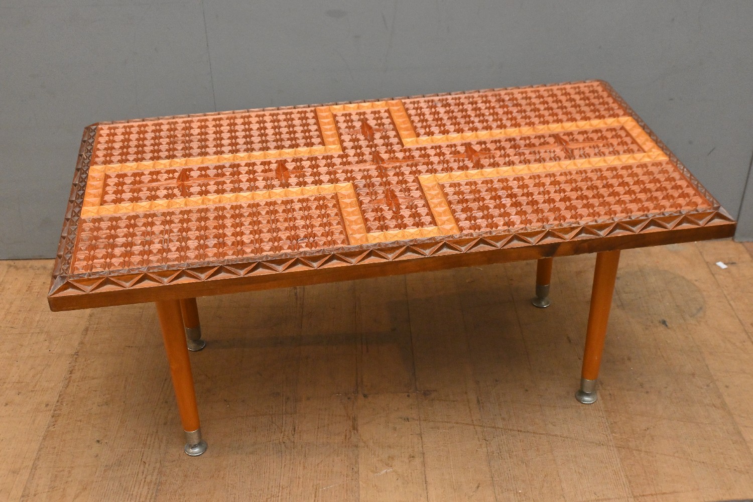 A 1960s COFFEE TABLE WITH CHIP-CARVED TOP (A/F) (44H X 96W X 50D CM) (LEONARD JOEL DELIVERY SIZE: LARGE)