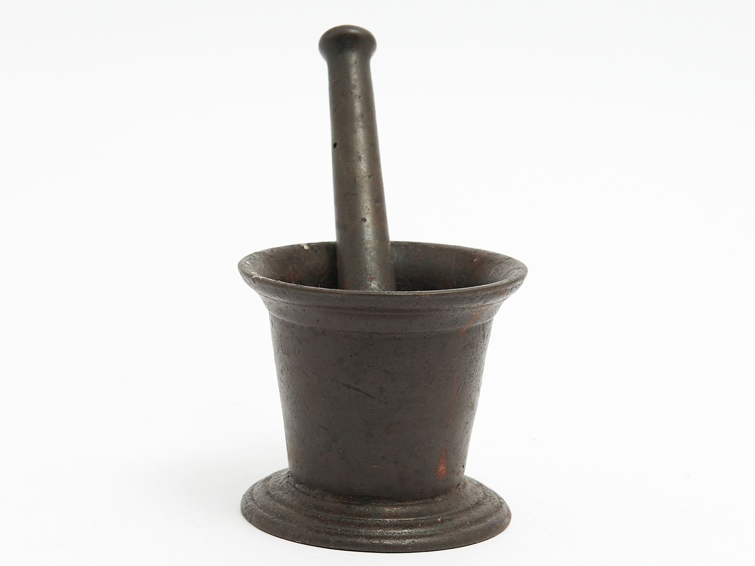 AN ANTIQUE ENGLISH CLARK AND CO STAMPED CAST-IRON MORTAR AND PESTLE NUMBER 3 5 INCH, H.10.5CM (MORTAR), LEONARD JOEL DELIVERY SIZE: SMALL