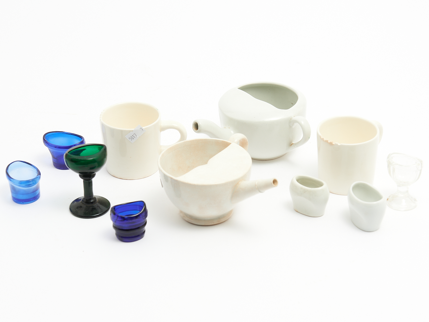 A COLLECTION OF VINTAGE MEDICAL AND INVILID FEEDERS, AND BLUE AND GREEN GLASS EYE WASHES L.15CM (LONGEST), LEONARD JOEL DELIVERY SIZE: SMALL