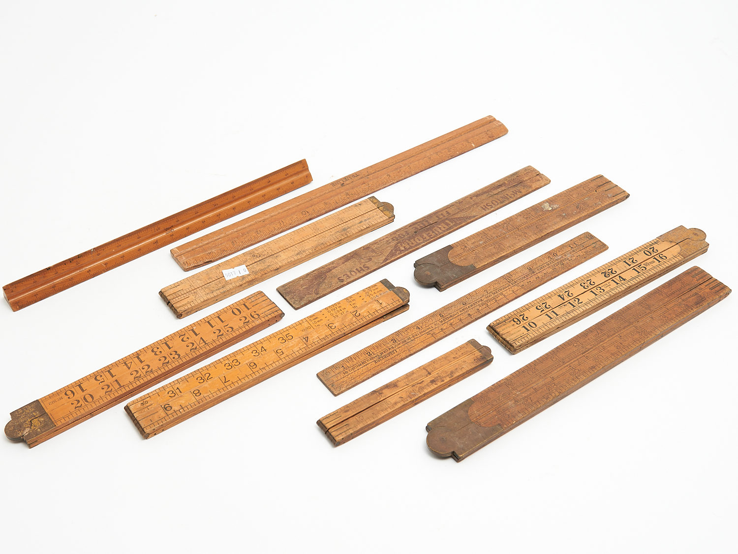 A COLLECTION OF EARLY 20TH CENTURY ENGLISH AND AUSTRALIAN BOXWOOD AND BRASS FOLDING RULES INCLUDING RABONE L.38CM (LONGEST), LEONARD JOEL DELIVERY SIZE: SMALL