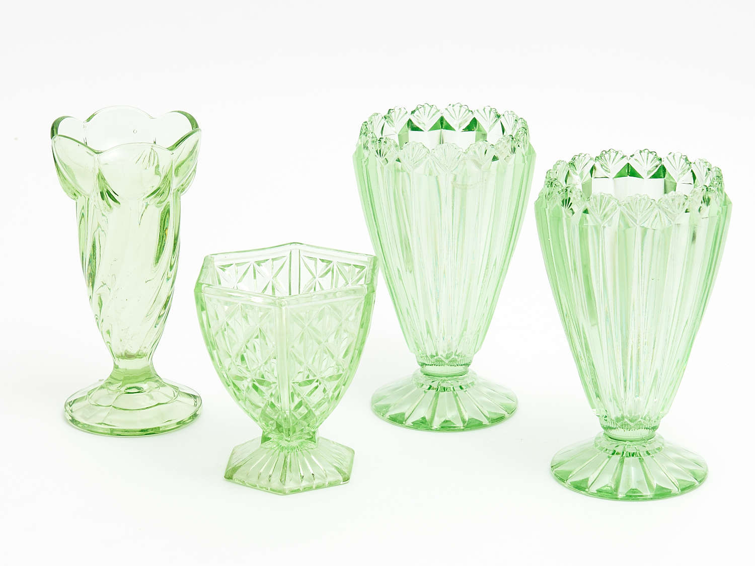 FOUR DEPRESSION GLASS VASES H.20CM (TALLEST), LEONARD JOEL DELIVERY SIZE: SMALL