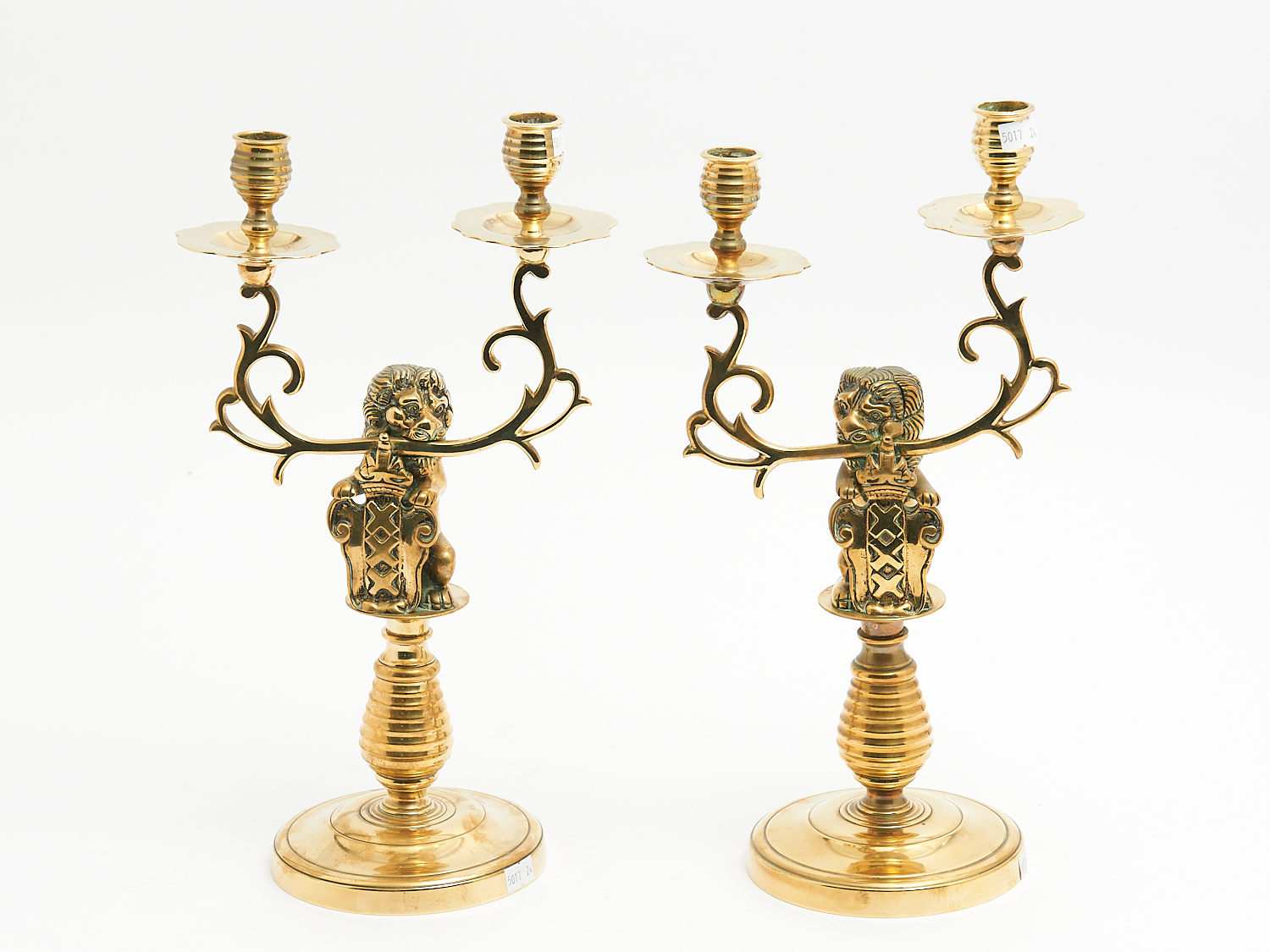 A PAIR OF EARLY 19TH CENTURY ENGLISH BRASS LION ADORNED TWO SCONCE CANDELABRAS H.37.5CM, LEONARD JOEL DELIVERY SIZE: SMALL
