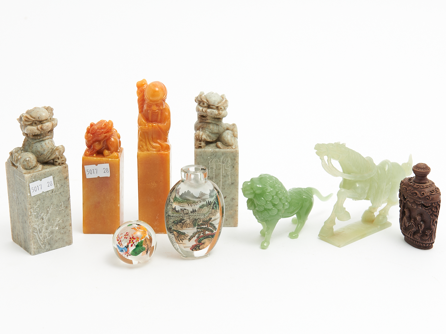 A COLLECTION OF CHINESE HARDSTONE AND INSIDE PAINTED STUFF BOTTLES, SEALS AND FIGURES L.13.5CM, LEONARD JOEL DELIVERY SIZE: SMALL