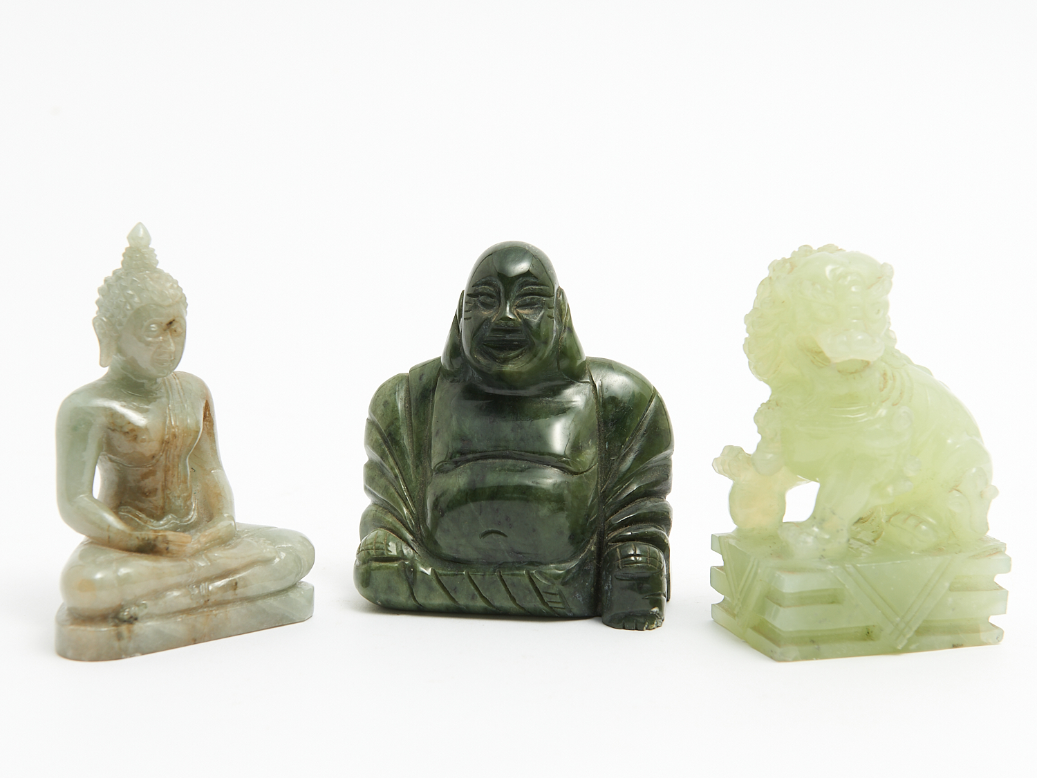 THREE CHINESE CARVED HARDSTONE FIGURES INCLUDING TWO JADE BUDDHAS AND FOO LION H.11CM (TALLEST), LEONARD JOEL DELIVERY SIZE: SMALL