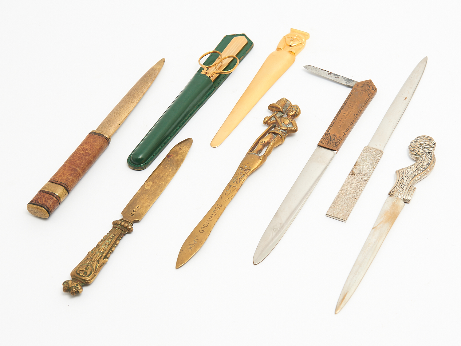 EIGHT BRASS, NICKEL PLATE AND GILT METAL LETTER OPENERS L.22.5CM, LEONARD JOEL DELIVERY SIZE: SMALL