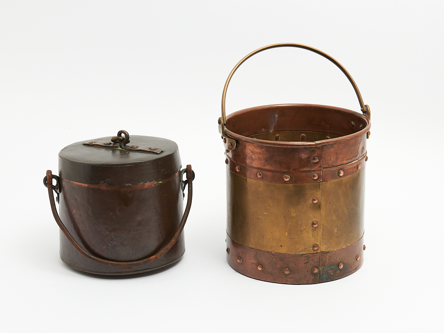 TWO FRENCH BRASS AND COPPER SWING HANDLE BUCKETS, ONE LIDDED H.23CM (TALLEST), LEONARD JOEL DELIVERY SIZE: SMALL