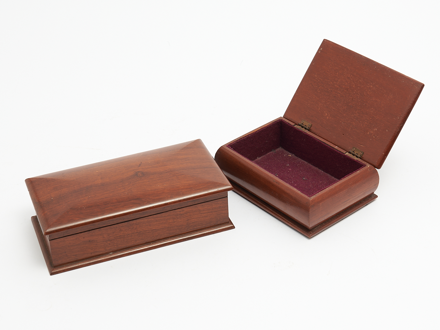 TWO VINTAGE AUSTRALIAN BLACKWOOD HINGE LIDDED JEWELRY BOXES L.21CM (LARGEST), LEONARD JOEL DELIVERY SIZE: SMALL