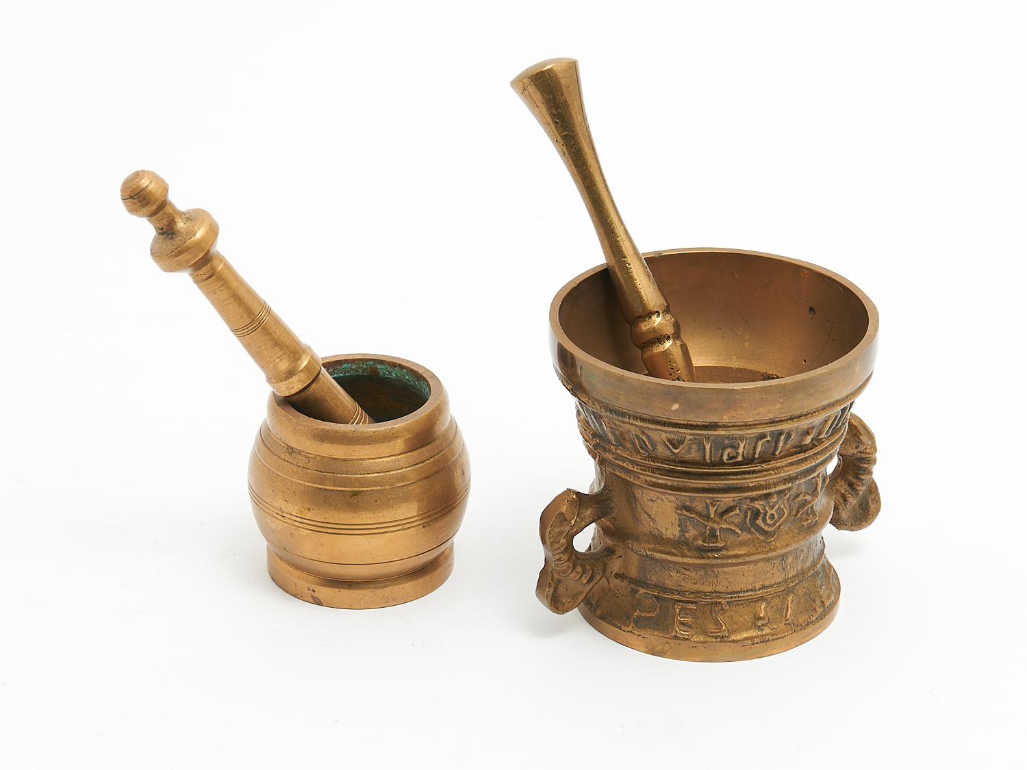 TWO ANTIQUE BRASS MORTAR AND PESTLE'S INCLUDING ONE WITH EXTERNAL DECORATION H.11CM (LARGEST MORTAR), LEONARD JOEL DELIVERY SIZE: SMALL