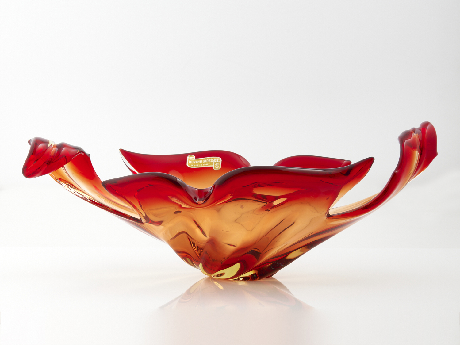 A MURANO GLASS RUBY AND ORANGE TWIST END CENTRE BOWL WITH ORIGINAL GOLD FOIL LABEL L.34CM, LEONARD JOEL DELIVERY SIZE: SMALL